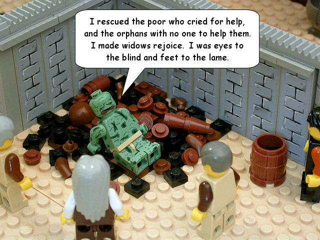 Job 29:12 'I rescued the poor who cried for help, and the orphans with no one to help them. I made widows rejoice. I was eyes to the blind and feet to the lame.'