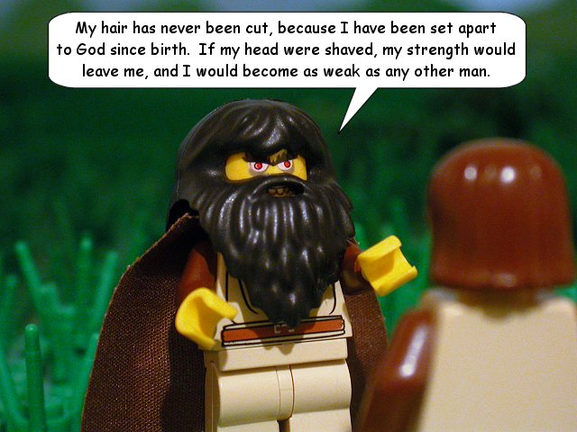 Judges 16:17 Finally he told her his secret, saying, 'My hair has never been cut, because I have been set apart to God since birth. If my head were shaved, my strength would leave me, and I would become as weak as any other man.